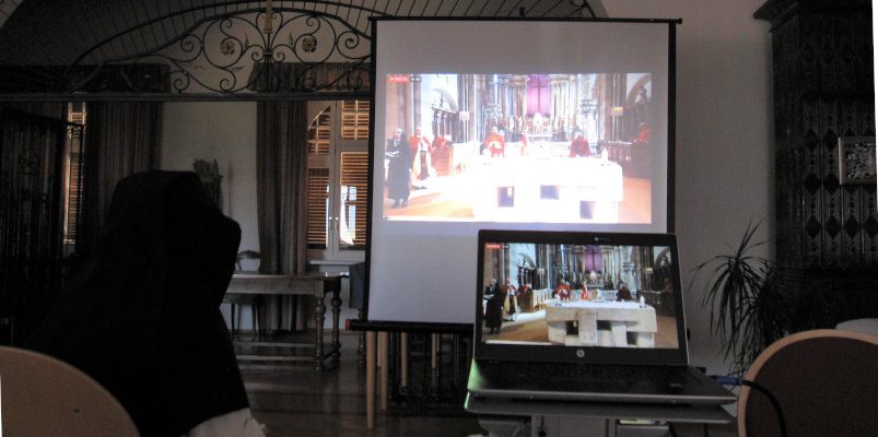 Über livestream mit den Zisterziensermönchen aus dem Stift Heiligenkreuz. Die Verbindung reicht bis nach Mariengarten ins Kloster nach Südtirol.