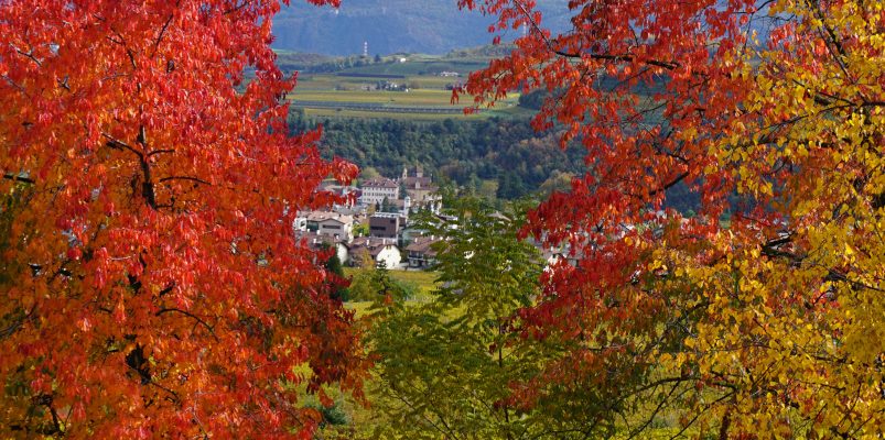 Eine Herbstmalerei von Kreuzstein aus. Mariengarten zwischen bunten Kirschbäumen.