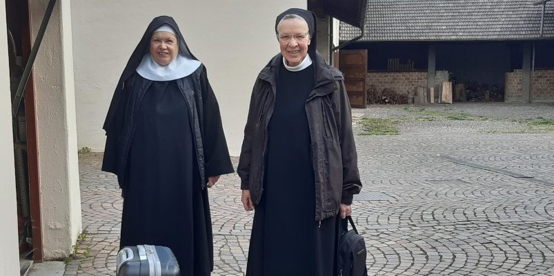 Mutter Irmengard und Mutter Ancilla bei einem kleinen Spaziergang im Kreuzgang.