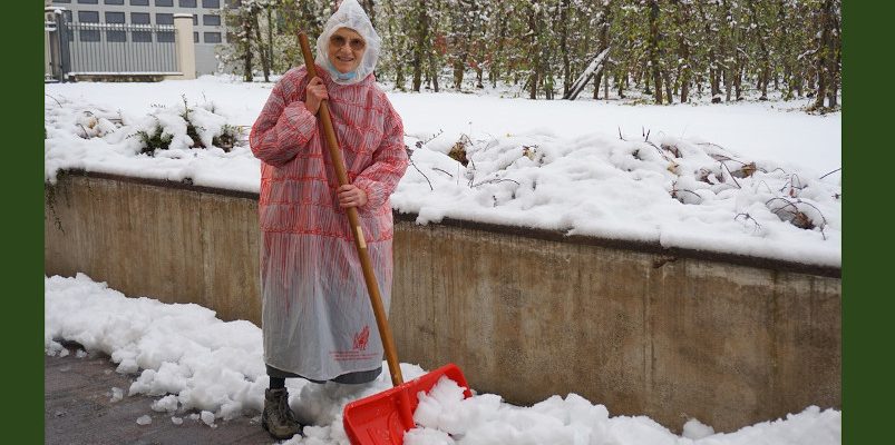 Da heißt es einfach zupacken und Schnee schaufeln. Klosterzwerg bei Schneeräumungsarbeiten.